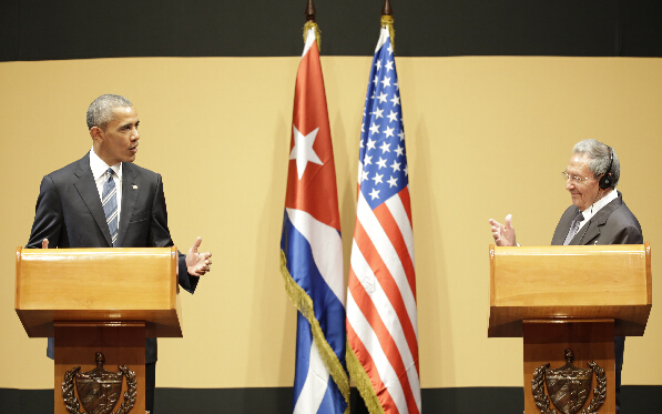 3月21日,在古巴首都哈瓦那,到访的美国总统奥巴马与古巴领导人劳尔·卡斯特罗出席联合新闻发布会。