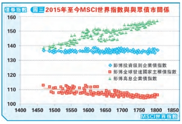 不過,債市規模龐大,真是所有債都跟股票一樣被炒至天昏地暗嗎?先看看第一段時期的2011年中希債危機,當期MSCI世界指數跌了差不多兩成,同期高息企業債亦跌近一成,但重點不在此。圖二見到,在高息債與股市同跌下,當期投資級別企業債不跌反升,升近4%,同期的發達國家主權債亦錄得相若升幅。由此可見,是不是所有債都跟股市同升同跌呢?不一定,起碼優質債就似乎有抗跌力。
