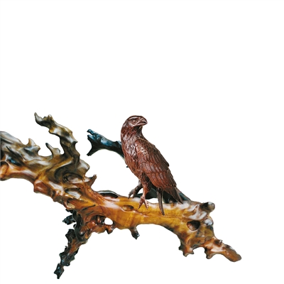 天然本色也是根雕爱好者的审美看点,因为树根天然的颜色和纹理是根雕艺术品最为自然的表象,也是根雕艺术品价值的直接表现,所以切记不要用人工来随意增加颜色,失去本色的根雕几乎没有收藏价值。樟木树根色泽较好,古朴自然,香味怡人,是做根雕艺术品的好材料;红豆杉树根木质不易开裂、变形、腐烂,从淡红到深红直到变成红褐色,给人一种古色古香的感觉。