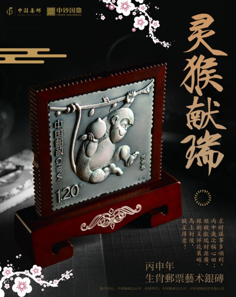 1月15日,中国集邮总公司和中钞国鼎投资有限公司联合开发的生肖邮票贵金属高浮雕仿印产品——《丙申年》生肖邮票艺术银砖正式发行。作为一款将整套《丙申年》特种邮票双面仿印的贵金属银质产品,在设计方面精益求精,在同比放大的银砖上用高浮雕和做旧工艺将《丙申年》邮票的生肖形象进行了艺术表现,经过独到设计,精雕细琢,使得银砖呈现一种独特的视觉效果。