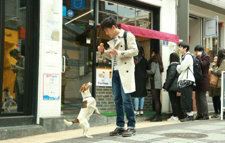 凤凰娱乐讯 23日,一组胡歌在街头与狗狗互动的照片在网上曝光。