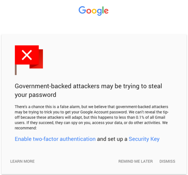 除此之外,谷歌還將繼續與政府支持的攻擊行為展開斗爭。當系統發現有政府支持的黑客正在監控用戶時,便會展示一條全屏警告信息。谷歌曾經在官方博客中表示,只有不到0.1%的Gmail用戶會收到這種警告,但由于看到這一警告信息的往往是記者、政策制定者和激進人士,使得這種警告變得尤為重要。