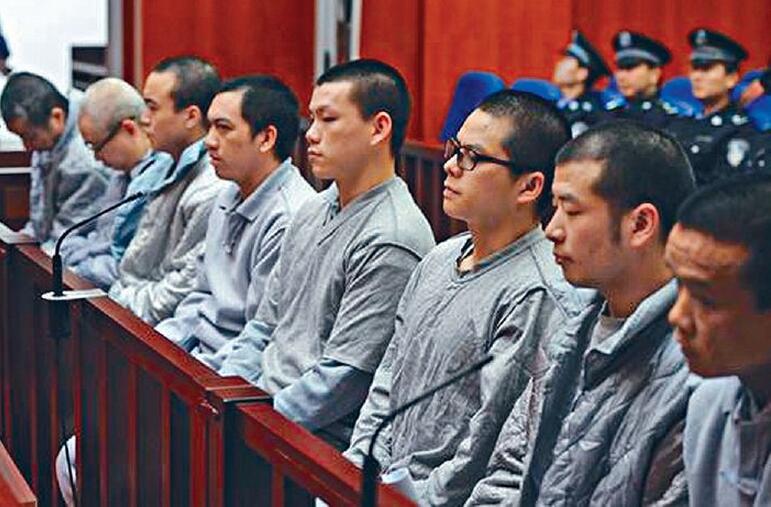 该八名被告分乘两辆囚车,昨晨九时四十五分到达深圳市中级人民法院,每人分别由两名身材高大法警押解入法庭,听取法庭宣布他们所涉罪名。