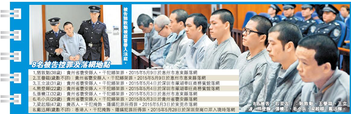 涉及罗君儿绑架案的八名贵州帮被告(二十三至四十岁),昨在深圳市中院刑事审判庭受审。八名被告中犹敦魁、王誉锟、王立波、熊登辉、张袄江、毛小兵等六人被控绑架罪,另两被告梁起顺及戴迅辉,被控掩饰、隐瞒犯罪所得罪名,案件今日继续审理。