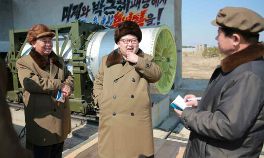 朝中社3月24日提供的照片显示,朝鲜最高领导人金正恩(右二)指导大推力固体火箭发动机地上点火试验和多级火箭箭体分离试验。据朝中社当日报道,朝鲜近日成功进行大推力固体火箭发动机地上点火试验和多级火箭箭体分离试验。朝鲜最高领导人金正恩对试验进行了指导。报道并未说明试验举行的时间及地点。