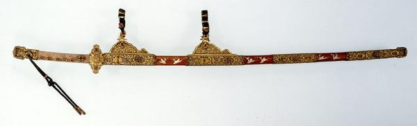 这把平安时代的《梨地螺钿金装饰剑》是我们非常受年轻女性欢迎的一件展品。为什么年轻女孩喜欢这些东西呢,因为有一款年轻女孩非常喜欢的手游,游戏的主人公是刀剑变身的英俊男子,其原型就是我们东京国立博物馆的藏品之一,所以现在的年轻人很喜欢到东京国立博物馆来看这件作品。日本很多的流行文化都是从博物馆中距今成百上千年的文物中汲取灵感的。