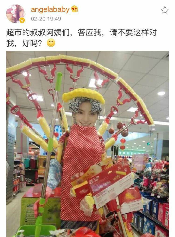 据台湾媒体报道,黄晓明昨日中午在网上晒出自己与老婆Angelababy的另类照片,图片中两人头像被超市分别用作展示促销产品。图中的黄晓明身体被几块竹席拼变一身盔甲,就连靴子都用上竹席,但双脚太过纤瘦,跟大头很不相衬;至于Baby则早在早前已贴出照片,她的头像身后插了多把拖布,当时Baby留言:“超市的叔叔阿姨们,答应我,请不要这样对我,好么?”这次轮到老公留言:“超市阿姨们神一样的存在系列之--请放过我们夫妻俩”。