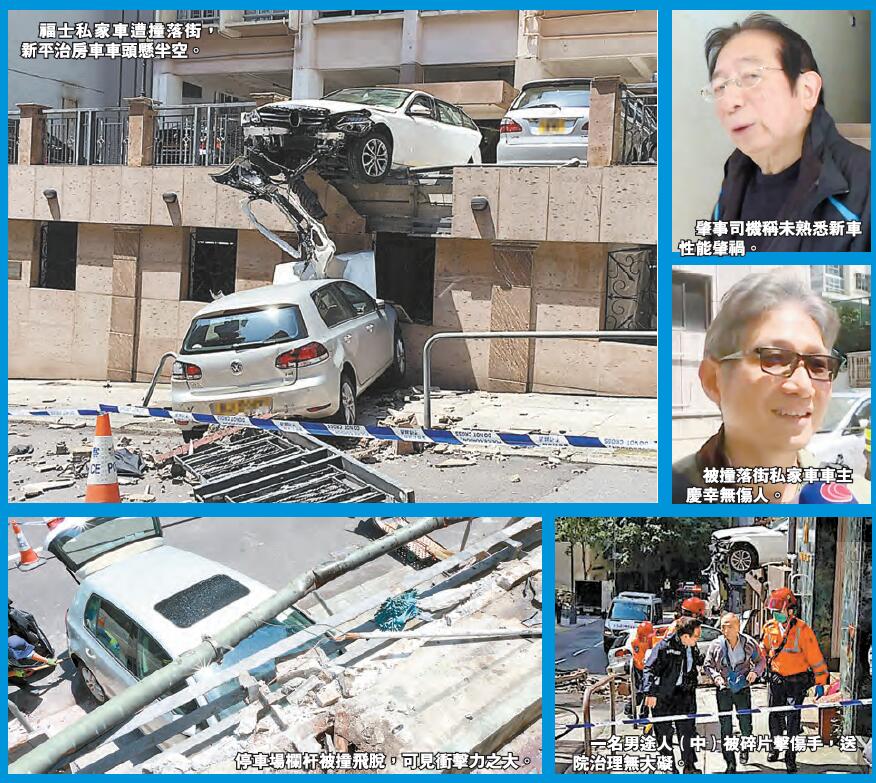 至於被撞落楼的福士车姓周男车主,当时正在楼上寓所,至接获警方通知才知出事,随後落楼协助调查。他估计有人踩错油门肇事,认为纯属一宗交通意外,万幸无人伤亡;会交由保险公司跟进。两车事後俱由警方拖走调查。
