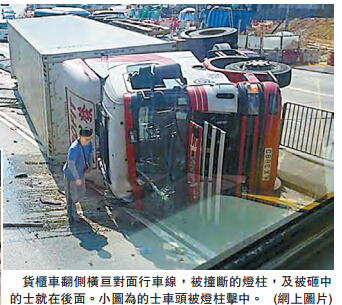 【香港商报网讯】记者冯仁乐报道:红磡昨日下午发生惊险交通意外,一辆货柜车行经漆咸道北时失控翻侧,压毁路中石壆,电灯柱亦应声倒下,恍如「横扫千军」,击中对面线一辆驶至的士挡风玻璃,幸的士司机及早发现已扭浃闪避,逃过「斩头」之灾,的士司机与女乘客受伤送院。司机事后称:「以为死梗!」现场交通受阻近两小时。