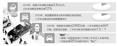 然而,中國二手車市場無論規模還是水平,都與世界第一汽車市場的身份不相稱。中國汽車流通協會統計顯示,2015年中國新車銷售近2460萬輛,可二手車銷售只有941萬輛,銷售額近5500億元,增速只有2%。而在歐美發達國家,二手車與新車的銷售比例為1.5∶1。按此比例測算,中國二手車潛在市場規模將達到每年3600萬輛,潛在銷售額每年約2萬億元。按另一種方式測算,中國二手車年銷量只占機動車保有量的5.5%,而日本約為11%,美國為16%。即便達到日本水平,我國二手車年銷量也將達到1700萬輛,成長潛力巨大。而盤活二手車存量,不僅為新車消費創造了新空間,還能帶動維修、保養、保險、金融等行業發展。