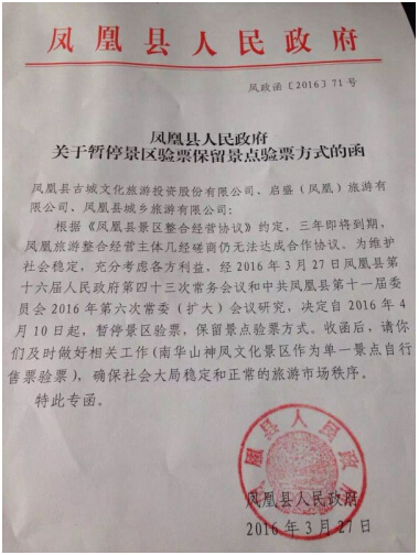 函件稱,根據《鳳凰縣景區整合經營協議》約定,三年即將到期,鳳凰旅游整合經營主體幾經磋商仍無法達成合作協議。為維護社會穩定,充分考慮各方利益,經2016年3月27日鳳凰縣第十六屆人民政府第四十三次常務會議和中共鳳凰縣第十一屆委員會2016年第六次常委(擴大)會議研究,決定自2016年4月10日起,暫停景區驗票,保留景點驗票方式。收函后,請你們及時做好相關工作(南華山神鳳文化景區作為單一景點自行售票驗票),確保社會大局穩定和正常的旅游市場秩序。