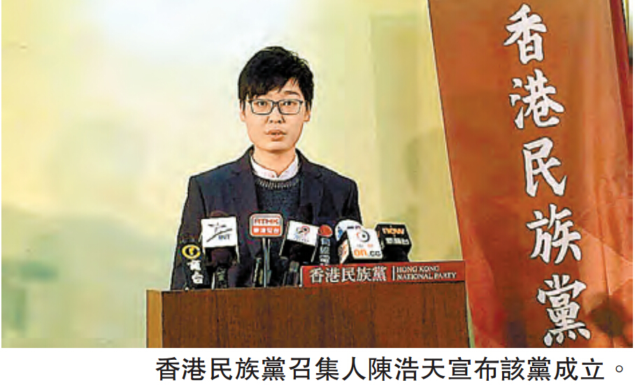 「香港民族党」昨日举行记者会,声称「建党」,而目标竟是「民族自强,香港独立」,并举出所谓「六大纲领」,包括「建立独立和自由的香港共和国」、「扞卫港人利益,以香港人利益为本位」、「巩固香港民族意识,确立香港公民的定义」、「支持并参与一切有效抗争」、「废除未经港人授权的《基本法》,香港宪法必须由港人制订」,以及「建立支持香港独立的势力,在经济、文化、教育各方面成立以香港为本位的组织和政治压力团体,奠定自主的势力基础」。