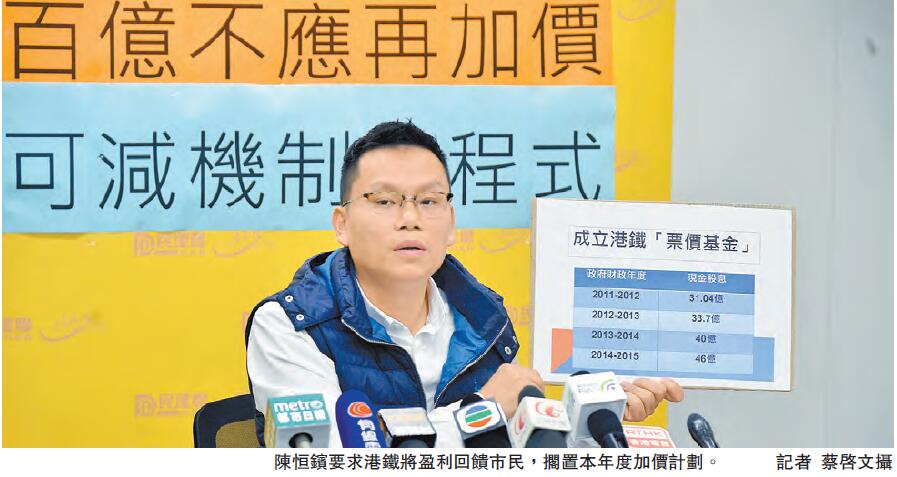 港铁票价「可加可减机制」实施多年,车费却年年有加无减。政府今日将公布去年第四季运输业工资变动指数,意味着港铁公司届时可以再按「可加可减机制」计算及加减车费,预料票价将会连续第7年上调。民建联立法会议员陈恒镔昨日召开记者会,要求港铁将盈利回馈市民,搁置今年度的加价计划。
