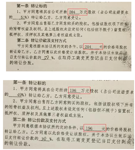 該公司注冊資本金總計400萬元,在轉讓前,這兩大股東分別持有的51%、49%的股權。最終,這一公司100%的股權,僅以400元的價格完成轉讓。