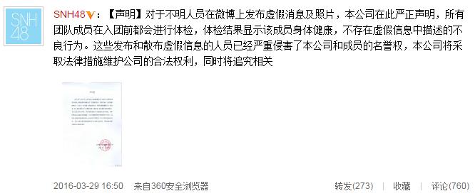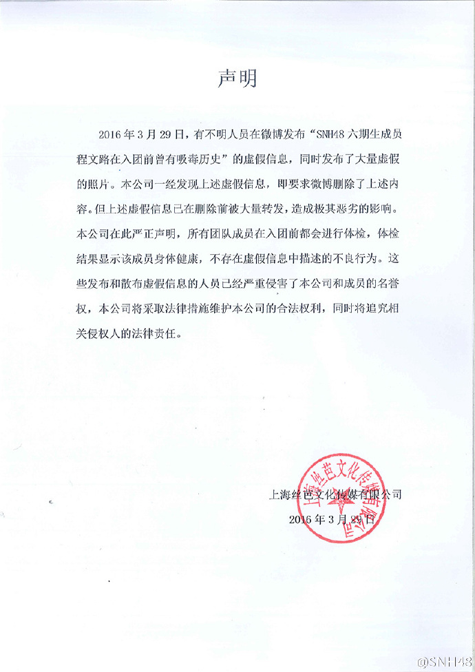 该微博在声明中表示,2016年3月29日,有不明人员在微博发布“SNH48六期成员程文路在入团前曾有吸毒历史”的虚假资讯,同时发布了大量虚假的照片。本公司一经发现上述虚假资讯,即要求微博删除了上述内容。但上述虚假资讯已在删除前被大量转发,造成极其恶劣的影响。