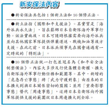 《朝日新聞》昨日的社評指出,新安保法放寬了對自衛隊海外活動的限制,為日美軍事一體化開路,「從此日本還能拒絕美國的強硬要求嗎?」《東京新聞》稱,日本一旦有陷入戰爭的傾向,就必須回頭,否則戰爭時代將再次來臨。《每日新聞》指出,自衛隊的運作方式是事關國家根本的問題,必須取得國民廣泛理解。