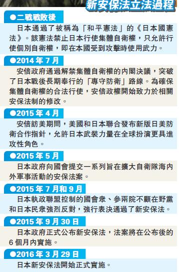 【香港商報綜合報道】日本安保相關法於當地時間29日零時起正式實施,歷屆政府基於《憲法》第9條不允許行使的集體自衛權也從此得以解禁。日本自衛隊可向他國軍隊提供后方支援等,海外活動由此擴大至全球規模,戰后日本的安保政策迎來重大轉變。有分析認為,安倍政府這種打破地區平衡的做法無益於地區乃至世界的和平穩定,其相關動作與論調需引起警惕。