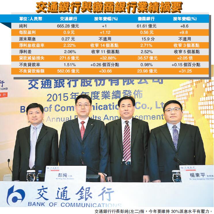【香港商報網訊】記者劉佳玲、林德芬報道:交通銀行(3328)業績昨日放榜,為重磅內銀股業績拉開序幕。受凈息差收窄及不良貸款率等增加因素,交行去年賺665.28億元(人民幣,下同),同比微升1.03%,符合市場預期;末期派息為0.27元,派息比率為30%。交行管理層指,今年要維持30%派息水平有壓力。