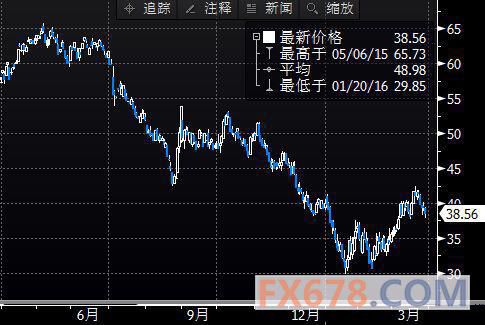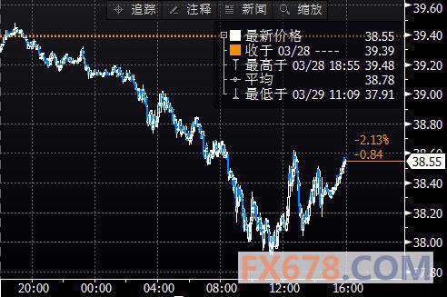 美國NYMEX 5月原油期貨價格周二(3月29日)收盤下跌1.11美元,跌幅2.80%,報38.28美元/桶,投資者擔憂周二公布的API原油庫存將再度大幅增加。與此同時,ICE布倫特5月原油期貨價格收盤下跌1.13美元,跌幅2.81%,報39.14美元/桶。