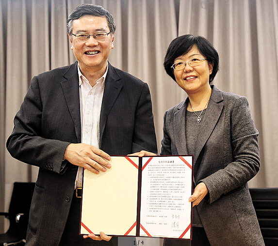 《经济导报》社长陈寅(左)与台湾《经济日报》社社长黄素娟签署了双方交流合作协定。