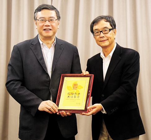 港媒高层赴台参访团团长、《经济导报》社长陈寅向台湾《联合报》社长项国甯(右)赠送纪念牌。