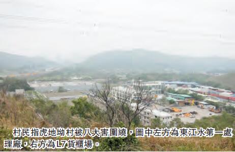 或許列安邦的大自然理論陳義過高,政府未必認同,虎地坳村若建污水設施,危害再增更合乎現實。廖志協帶同記者及參觀者步上村內靠山即虎地坳,這座小山可360度觀賞四周景色,但原來暗藏殺機。廖說村落被八大害包圍,包括未來污水處理廠第二期(污水中途泵房屬其範圍)、現有污水處理廠、上水屠房、高壓電塔、羅湖女子監獄、東江水第一處理廠、L7貨櫃場及約半年後投產的瀝青廠。「兩年前火燒山後,有好多碎石,可能受周遭環境如電壓、氯氣等影響,寸草不生,但在山下的村,靠山不可以是光頭的,我們自發上山種植物,年多以來還未見到成績。」