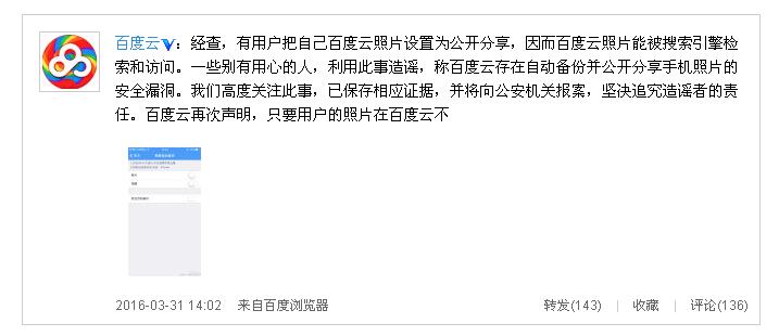 經查,有用戶把自己百度云照片設置為公開分享,因而百度云照片能被搜索引擎檢索和訪問。一些別有用心的人,利用此事造謠,稱百度云存在自動備份并公開分享手機照片的安全漏洞。我們高度關注此事,已保存相應證據,并將向公安機關報案,堅決追究造謠者的責任。百度云再次聲明,只要用戶的照片在百度云不主動設置為公開分享,就不會存在上述的安全問題。同時,百度云的自動備份默認是關閉的,只有用戶在主動開啟后才會執行。這跟國際通行的網盤規則是一致的。