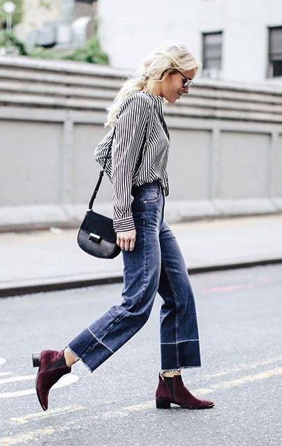 裤脚磨边的七分阔腿裤,真是两种流行趋势共存的单品(磨边与阔腿)。相同色系的衬衫塞进高腰裤里,再搭配一双黑色罗马露趾高跟鞋,轻轻松松增长比例,纤长而又时髦的造型瞬间展现。