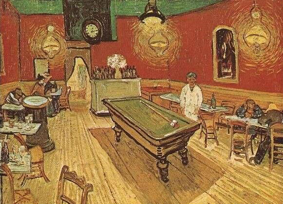 在布面油画《夜晚的咖啡馆》中,梵高利用其典型的粗糙笔触和大胆的色彩描绘了一家咖啡馆的内景,里面有一张桌球台,顾客四散的坐在各处。