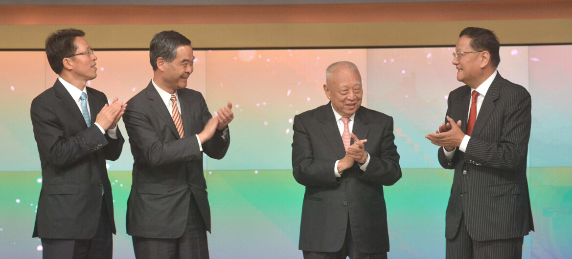(左起)中联办主任张晓明、梁振英、董建华和凤凰卫视董事局主席刘长乐。新华社