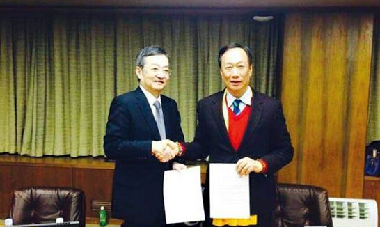 鴻海日前秀出郭臺銘(右)和夏普社長高橋興三的簽約照,見證雙方已達成9成的共識。