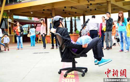 2013年,3月30日,西方愚人节即将来临,武汉欢乐谷上演了一场极具趣味性的“娱乐减压旋转椅竞速大赛”。参赛游客坐在办公旋转椅上,身体不离椅子,运用脚的力量,旋转着向目的地极速出发。比赛以两人一组接力进行,游客们纷纷上阵参与,“娱”乐愚人节。中新社发 胡芬 摄