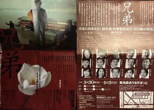中新网4月1日电 据日本《东方新报》报道,3月30日晚,余华的《兄弟》被改编为话剧,在日本上演。余华本人专程赴日,和观众们一起观看了表演,并在结束后面向观众一吐观后感言。