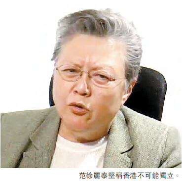 揚言鼓吹「港獨」的組織「香港民族黨」自從成立後,持續遭各界人士狠批。全國人大常委范徐麗泰昨日接受電子媒體訪問時表示,中央近日針對「港獨」的言論是要把話說清楚,又點出香港不可能獨立,並這樣解說:「不止憲法及《基本法》不容許,中央政府也不會容許,中國十幾億同胞亦不會容許;如果要走這條路(指『港獨』),你只是將香港帶入絕路,害死自己,也得不到你想要的。」