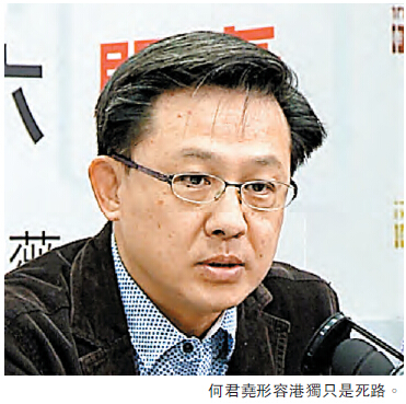 嶺南大學校董、律師會前會長何君堯昨日出席電臺節目時說,香港沒有可能獨立,更形容「港獨」只是死路一條,質疑提出獨立的人士缺乏政治常識。他不諱言,香港言論自由有限度,現在「開宗明義說香港獨立」,基本思維已違反《基本法》精神。他說,《基本法》指明香港是中國領土一部分,研究香港獨立便衝擊了《基本法》。