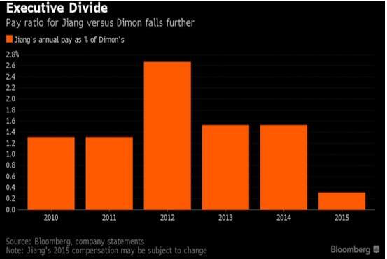 凤凰财经讯 4月4日据彭博消息,中国工商银行最新公布的年报显示,在中国政府对国有企业高管进行限薪的背景下,其董事长姜建清2015年的税前合计总薪酬较之前一年大幅下降了72%至546,800元人民币(84,584美元),据公开消息,这一数字仅相当于摩根大通首席执行官Jamie Dimon同期2700万美元收入的0.3%。2014年时,姜建清薪酬为Dimon薪酬的1.5%。