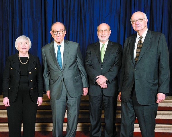 耶倫本港時間周五凌晨將與美聯儲前任主席伯南克(右二)、格林斯潘(左二)與沃爾克(右一)發表講話,勢受市場注視。