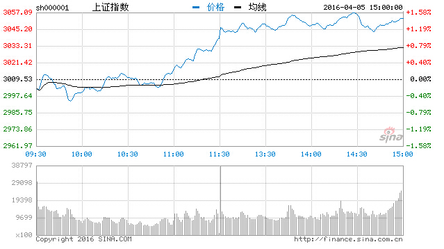 截止收盤,滬指報3053.07點,漲43.54點,漲幅1.45%,深成指報10640.27點,漲260.62點,漲2.51%,創業板報2279.52點,漲74.15點,漲幅3.36%。