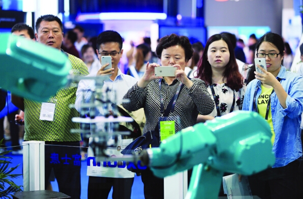 2015貴陽國際大數據產業博覽會暨全球大數據時代貴陽峰會期間,惠普、京東、谷歌、華為等380余家全球大數據領域領軍企業云集貴陽,展示大數據相關項目和應用。圖為數博會上展出的富士康智能生產線引來眾多圍觀者。(資料圖片)