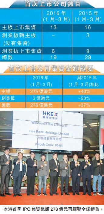 今年首季,本港首次上市公司數目錄得19宗,較去年首季的28宗下降32%,其中主板上市13宗,同比降19%,創業板上市6宗,同比降33%。不過,集資總額以278億元再蟬聯全球榜首,高於第二名的倫敦206億元及第三名的東京106億元。集資額增加得益於兩間大型中資銀行成功上市,其中一間集資額超過50億元,另一間則超過100億元。