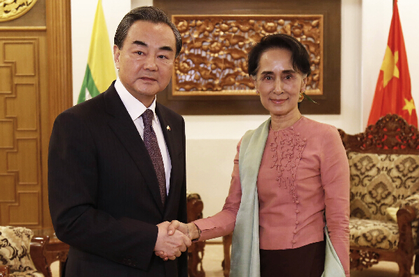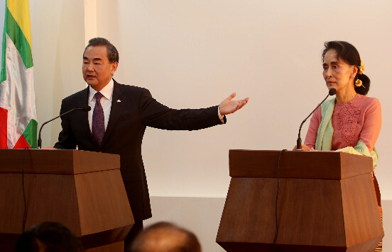4月5日,中国外交部长王毅(左)在缅甸内比都与缅甸外长昂山素季举行会谈。