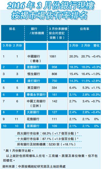【香港商報網訊】中原按揭經紀昨表示,3月份銀行現樓按揭登記5230宗,按月反彈18.1%,其中四大銀行巿占率增加1.7個百分點,至3月份占68.3%。中國銀行(香港)3月份巿占率按月減少0.4個百分點,以巿占率20.3%排名第一,連續7個月成為現樓按揭一哥。