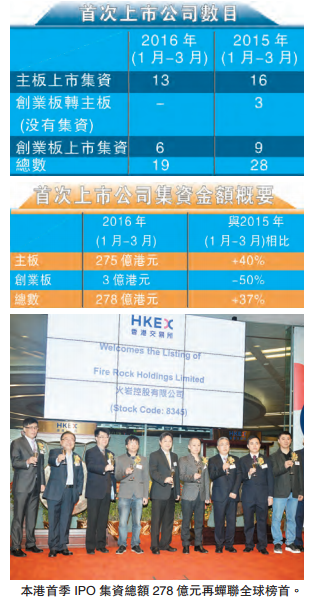 今年首季,本港首次上市公司數目錄得19宗,較去年首季的28宗下降32%,其中主板上市13宗,同比降19%,創業板上市6宗,同比降33%。不過,集資總額以278億元再蟬聯全球榜首,高於第二名的倫敦206億元及第三名的東京106億元。集資額增加得益於兩間大型中資銀行成功上市,其中一間集資額超過50億元,另一間則超過100億元。