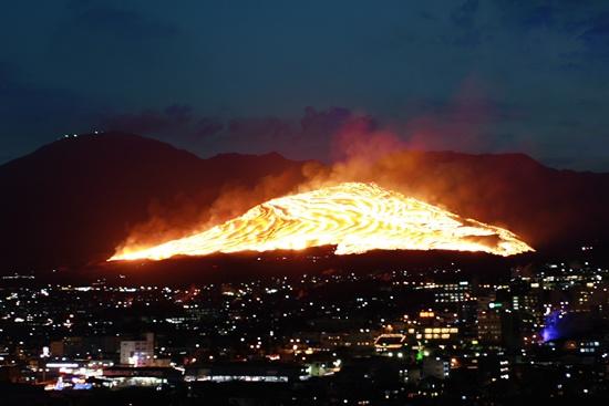 日本举行壮观“扇山火祭” 赤焰火龙染群山 夜空下,在水烟四起的温泉街后方,山上裸露的地表呈现出一幅被火焰染红的景象,游客们纷纷驻足观望。