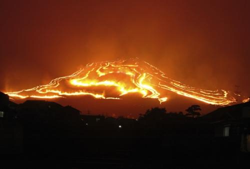 日本举行壮观“扇山火祭” 赤焰火龙染群山 据悉,该活动被认为是向在冬眠的温泉神告知春天已经到来而举行的祭奠。在工作人员点火后,火势随着被点燃的枯草呈带状向远处蔓延。