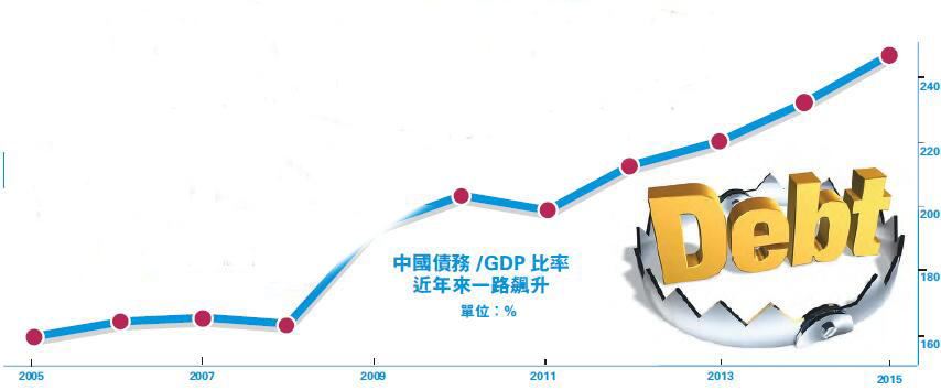 根據中國社科院研究,2008至2014年,中國經濟整體債務占GDP的比重,從170%上升至235.7%,6年上升了65.7個百分點。剔除金融機構,中國實體部門債務占GDP比重從2008年的157%上升到2014年的217.3%。2014年末,中國居民部門債務占GDP比重為36.4%,2008年后增長較快,翻了一倍有餘。中國政府部門債務占比為57.8%,而中國實體部門(非金融企業)債務率達到123.1%,高於美國、日本、德國,處於絕對高位,是中國總體杠桿率的主要來源。