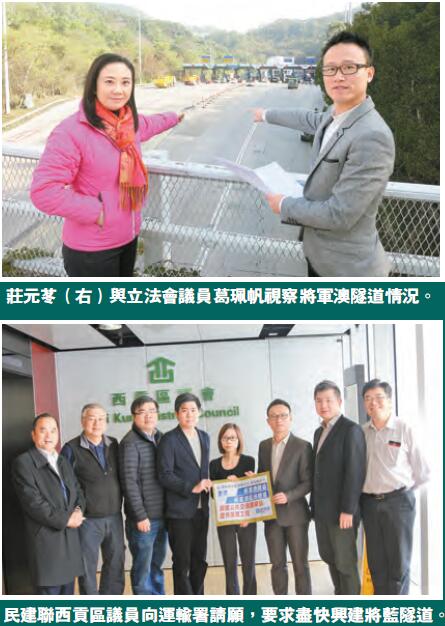 莊元苳表示,由於距離將藍隧道預計完工日期尚有5年時間,區議會要求政府研究方法紓緩將軍澳隧道擠塞問題,例如建議於將軍澳隧道收費廣場增設八達通收費系統以加快車流,運輸署方面回覆指預計於2017年前完工;亦建議重新研究隧道出入口的行車走線,并於上班的繁忙時段,實施「3線出九龍、1線入將軍澳」(潮水式)的行車方案(即3條同向的車輛在未駛入至九龍雙程隧道之前,將其中1條行車線經進入將軍澳雙程隧道至九龍)。署方回應區議會指現時在技術上有難度,待將藍隧道落成后才可能得到改善。民建聯對署方官僚回應表示強烈不滿,因為這是關系到全將軍澳居民的問題,故民建聯西貢將軍澳支部工作團隊將繼續密切監察,并要求政府盡快完成將藍隧道工程。