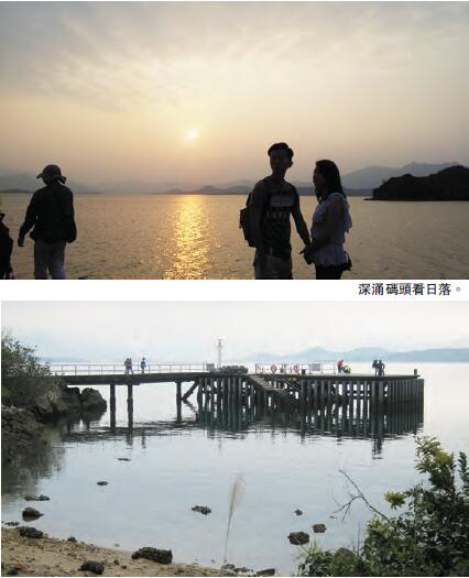 傍晚可乘渡輪回馬料水當地居民遷走后,房屋愈見破落,不過,仍有從小在外國的村民回流經營士多,供應食物予游人。而昔日熱鬧鄉情早被城市人的歡樂取代。在這趟海灣之旅的最后一站深涌流連后,可順道在深涌碼頭看夕陽,在餘暉中搭最后一班渡輪返回馬料水碼頭。