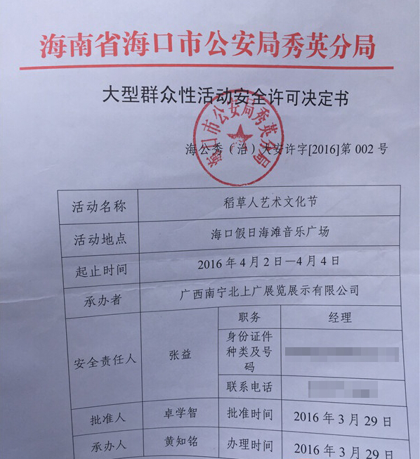 “我們這個展覽里面大概有30多個稻草人,展期是3天。”4月4日上午9點,記者接到市民投訴后前往展覽點了解情況,在現場,稻草人展覽負責人告訴記者,他們有公安部門審批的《大型群眾性活動安全許可決定書》,并給記者展示,記者看到上面的起止時間為4月2日到4月4日,承辦者為廣西南寧的一家展示展覽公司。