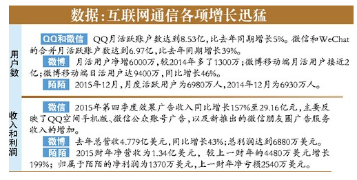 可以说,当前手机用户大多都安装使用了微信等社交工具。拥有同等用户数的微信、QQ和陌陌等社交工具,正在蚕食中国电信运营商的重要收入来源——语音通话和短信服务,但同时也给电信运营商带来流量收入的增长。